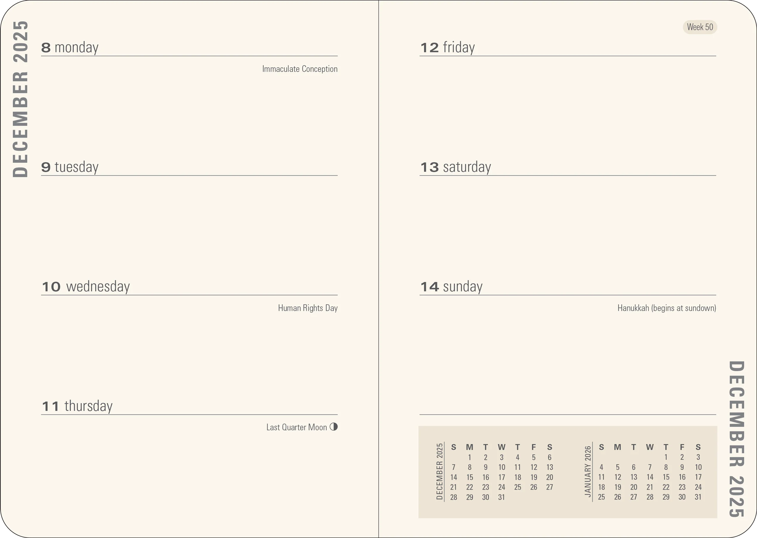- Weekly pages provide a 2-page spread with equal space for all 7 days.