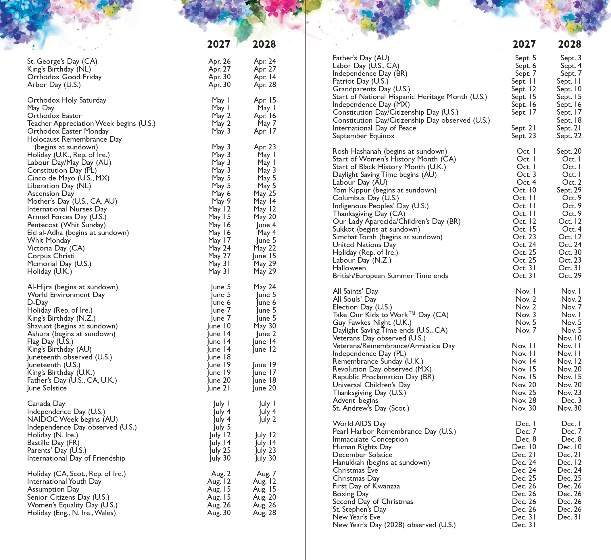 Covers 24 months (2 years, from January 2027 through December 2028).Ideal for those who prefer to view 1 month at a glance.Each 1-month spread includes mini month reference calendars (1 for the month past, 1 for the month ahead), plus ruled space for making notes.Holidays, observances, and lunar phases are included.An extra page is provided to note dates to remember.Premium paper supports pen or pencil.Calendar lies flat for writing ease.Comes with a protective clear plastic jacket.Vibrant floral design is enhanced with silver foil highlights.Measures 3-1/2'' wide x 6-1/2'' high.Lightweight little calendar is ideal for pocket, purse, or desk. Take it everywhere you go!