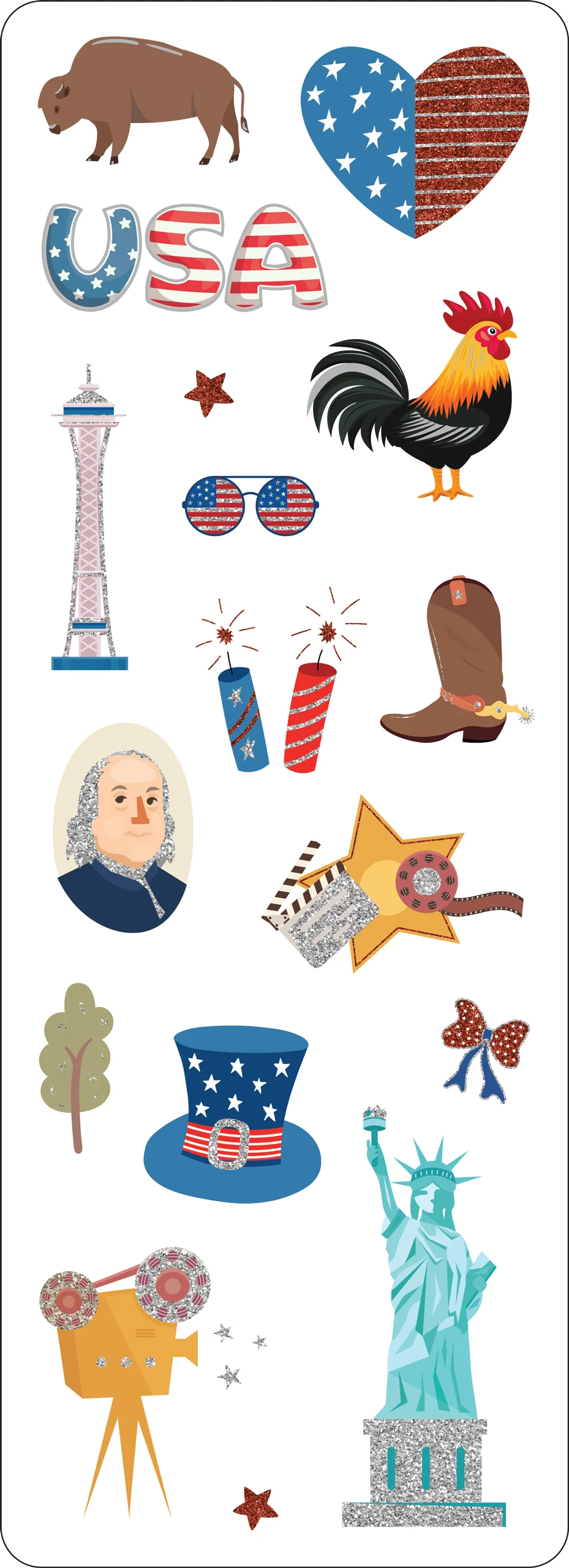 - Vibrant collection depicts a variety of all-American themes: eagles, the Liberty Bell, the Capitol, the Statue of Liberty, Founding Fathers, fireworks, baseball, pie, hot dogs, and more, plus fun accent stickers.