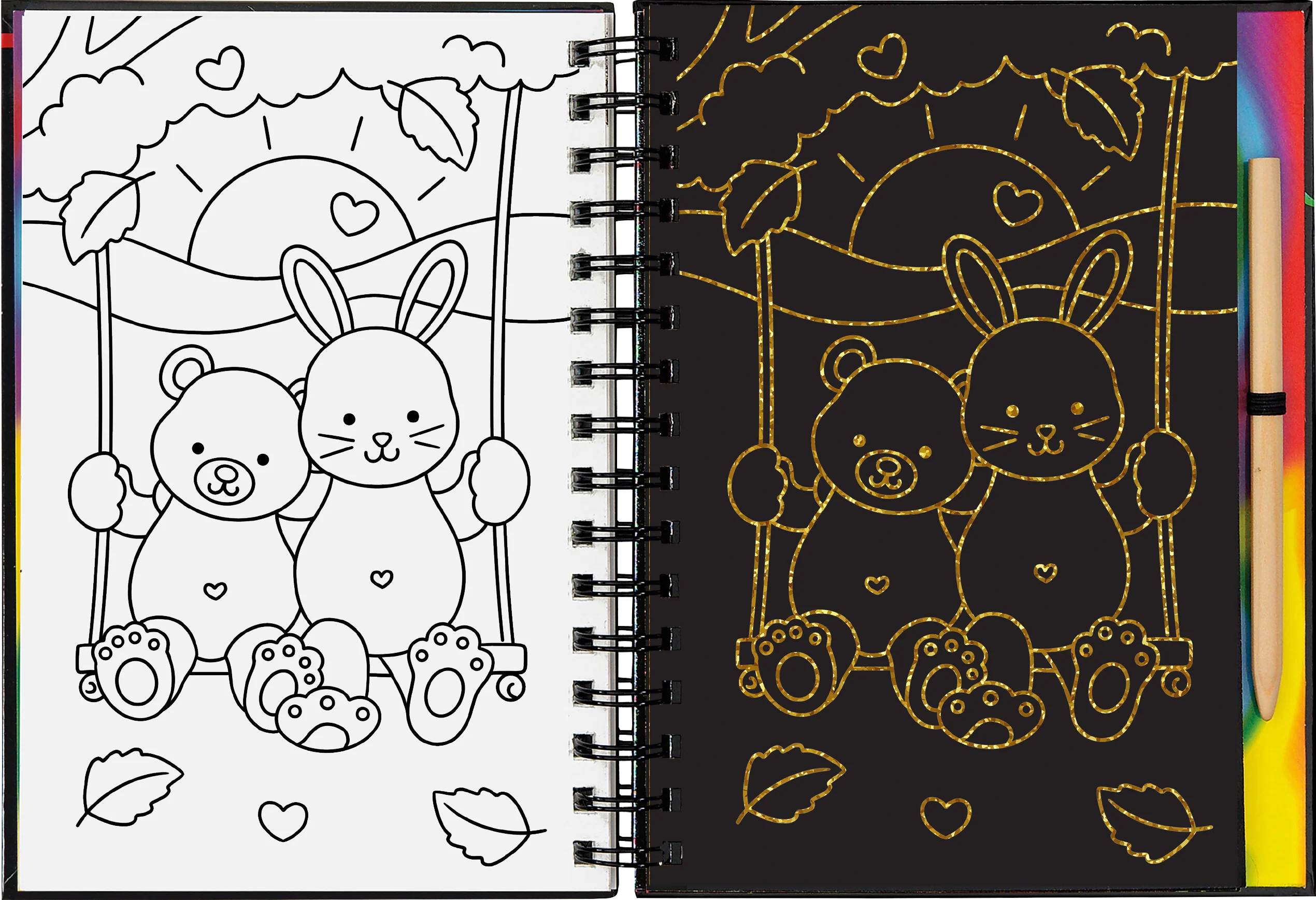 - Art activity book contains 20 black-coated scratch-off pages, 20 illustrated pages with fun text, and 20 extra pages for independent drawing.