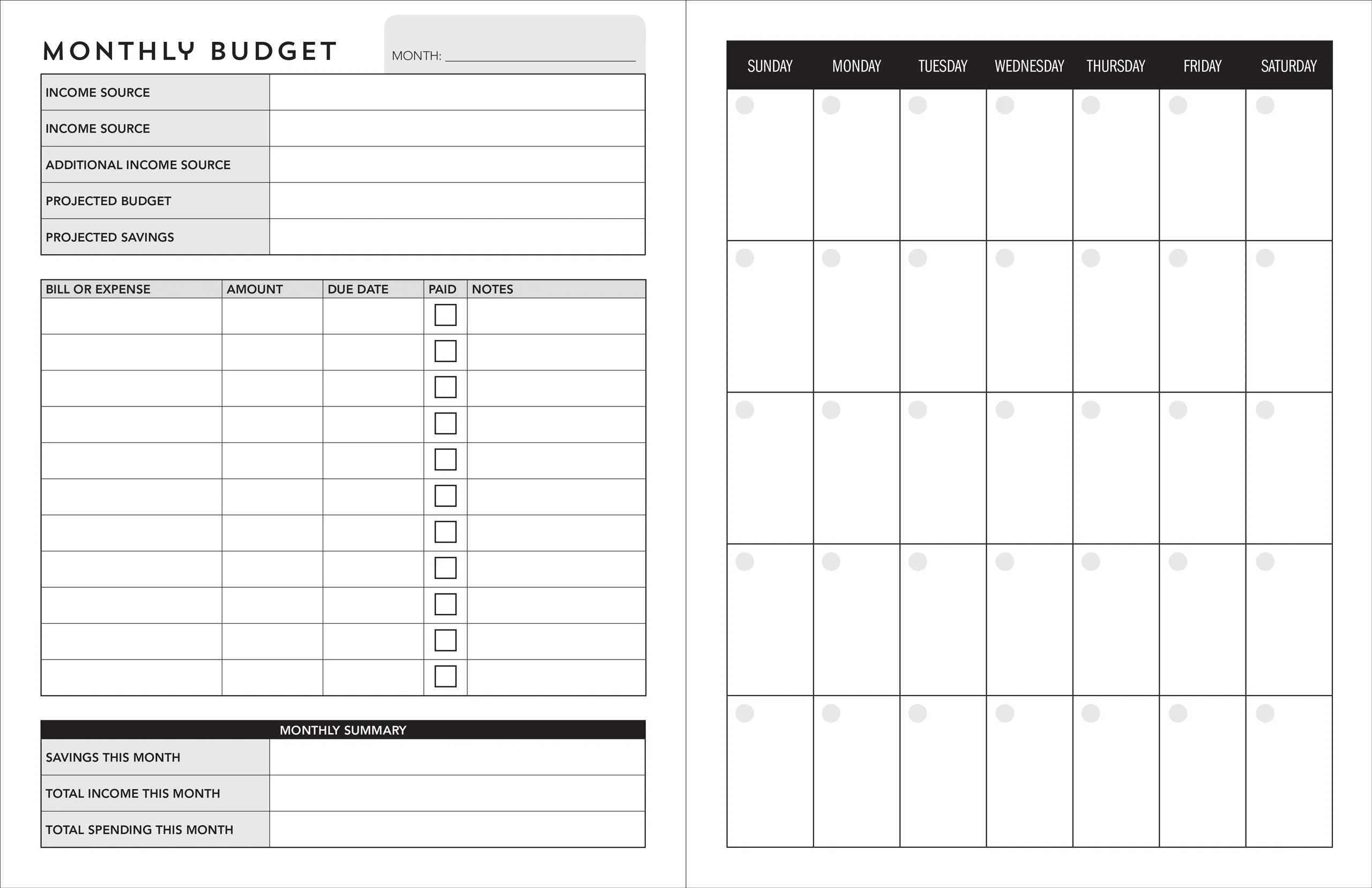 Record your weekly expenses and plan monthly budgets with simple, straightforward tracker pages.